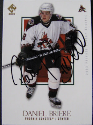 Mailed to Daniel Briere on 5/10/08 received 1/1 back on 5/27/08. I mailed this card during the postseason and it shows how classy a guy Mr. Briere is that he took his time to sign even in such an important time. Its a sweet signature from a great clutch player. Card was mailed to the Philadelphia Flyers.